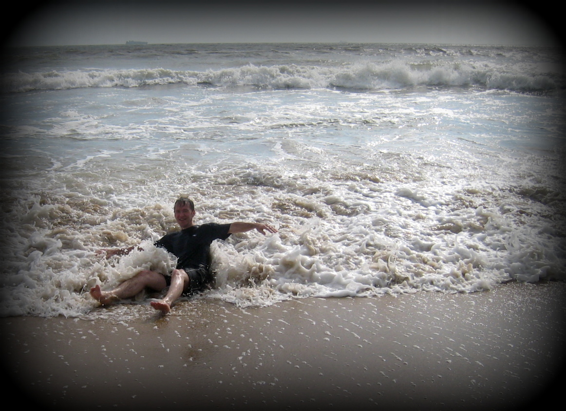 He stands by the edge of the water, watching for a moment, loving the pounding of the surf and constant ebb and flow – it reminds him of God’s immutability (never changing). But before long, he’s in with a smile of delight.