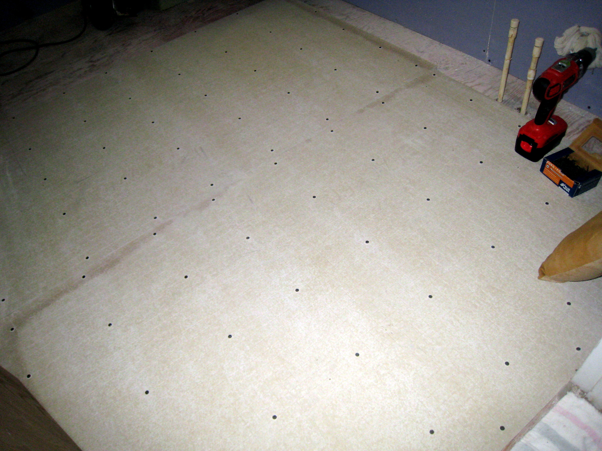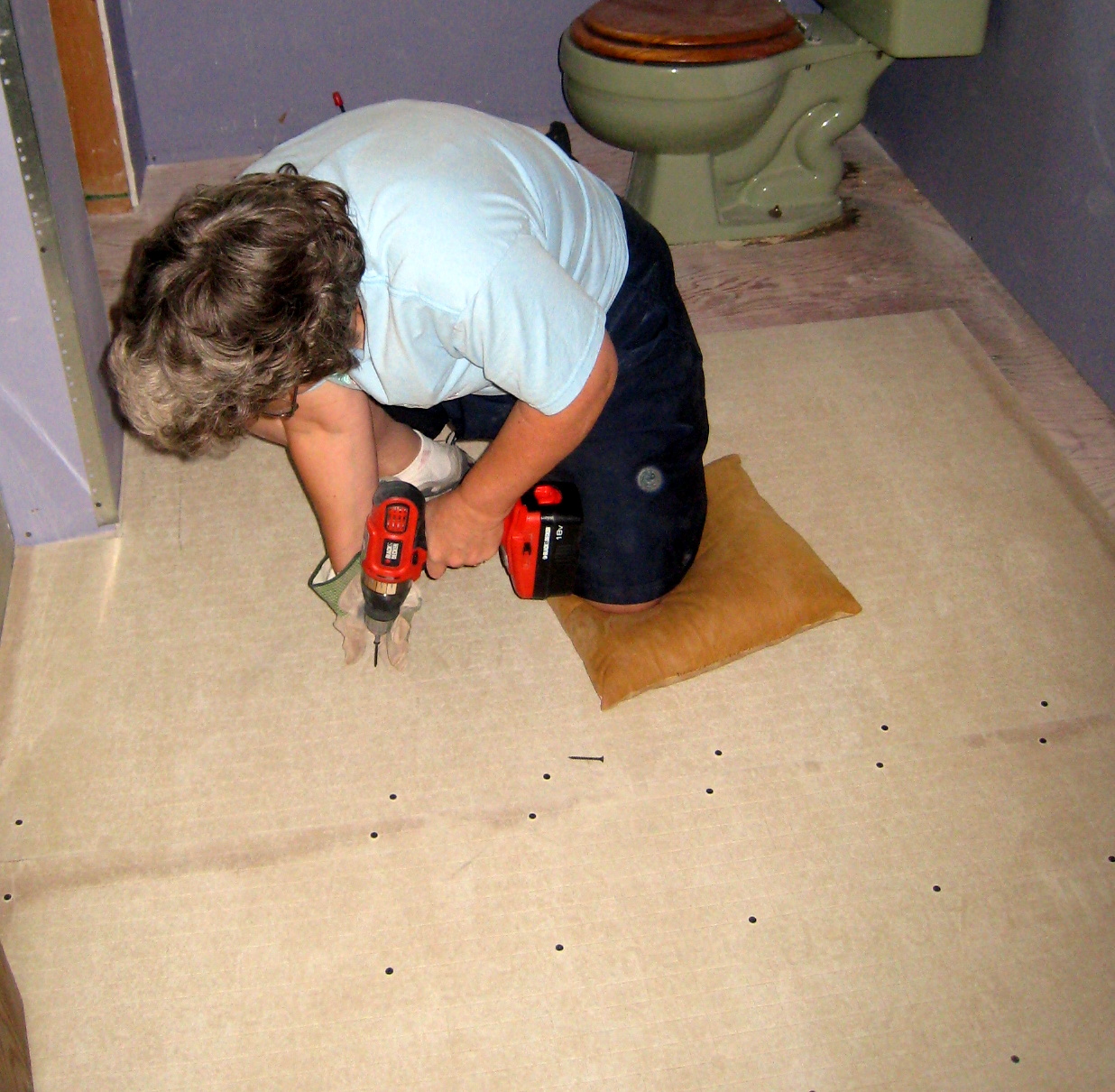 Move over Rosie the Riveter!! You may ask, “Wanda, what are you doing?” Well, since I’m a failure at gardening, I thought I’d go into carpentry! Not really. I am placing screws every eight inches, as suggested, into the hardie board that will then be covered with tile. Notice the beautiful sequential pattern! Notice the pillow for my knees and the gloved hand! Ah, the lessons abound!