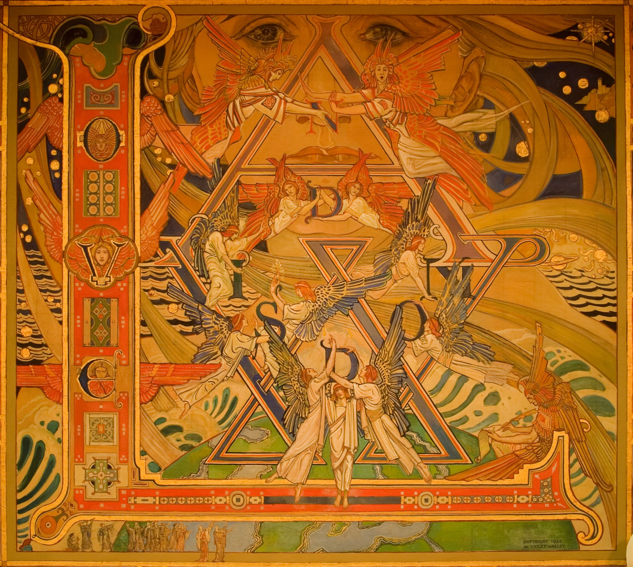 In those paintings, she depicted divine law, including the Ten Commandments, the beatitudes, and Christ walking on water. She weaves so much meaning into each painting. The mural that fascinated me the most was the one directly above the doorway, pictured below. You’ll see the big “L” very clearly, but if you look closer, you’ll also see the words love, wisdom, and law.