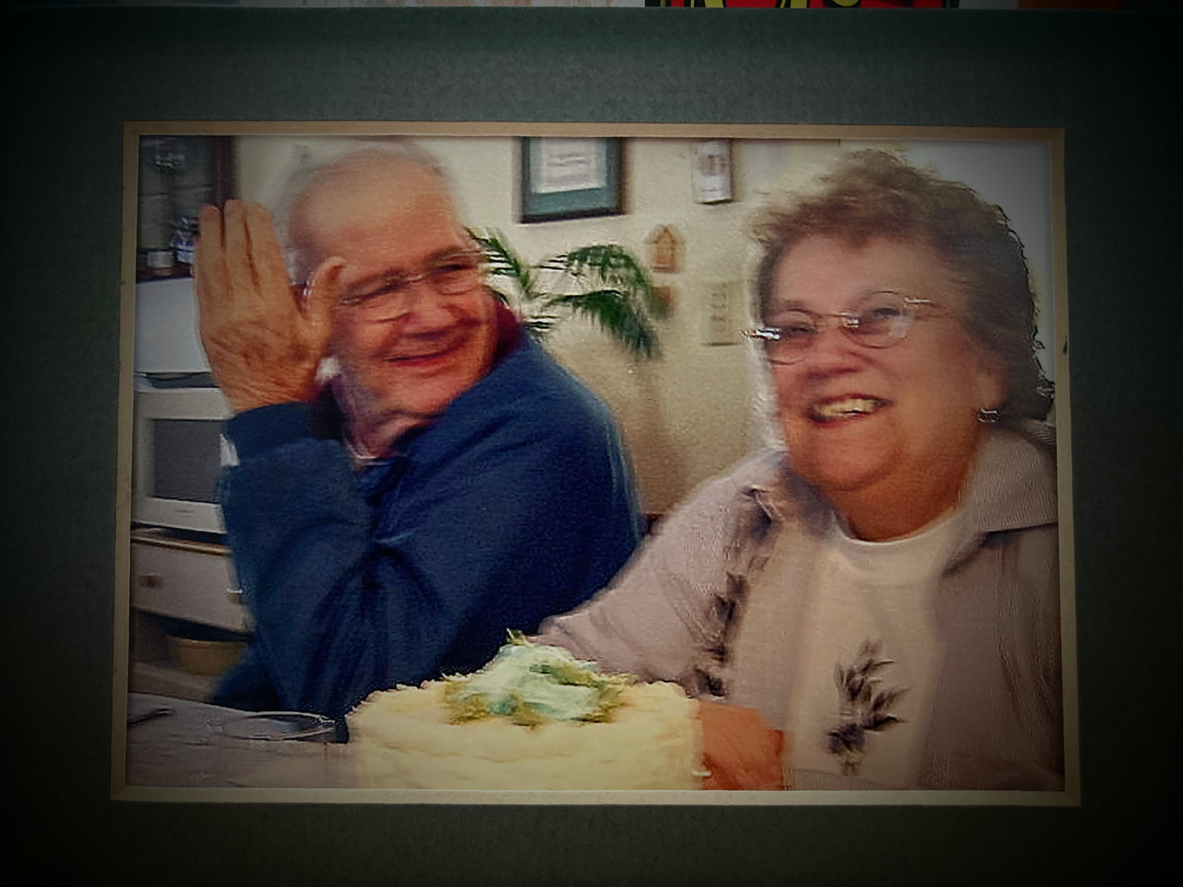 I get that too, but I am so thankful for this picture. It’s out of focus but I keep it on my dresser because of the memory it recalls. I believe it may have been my parents’ anniversary. It’s not the greatest picture of either of them, but it caught a moment that I’ll never forget. I don’t even know what was so funny, but oh, those smiles—they say so much! Mom was a bit gullible, and Dad just loved “pulling her leg.” Her laugh, his look, they bring an ache to my heart! I miss them so!